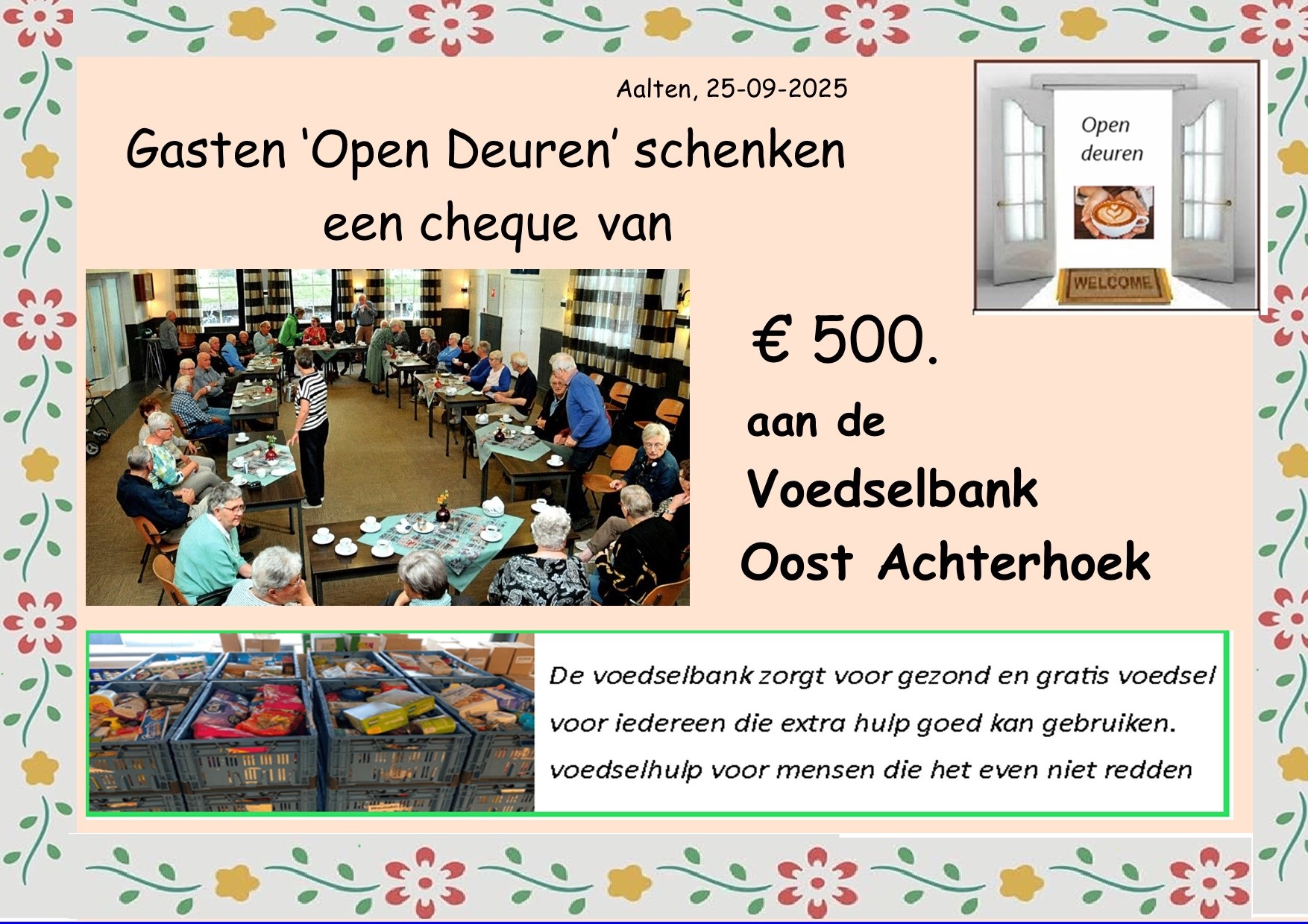 In het bijzijn van veel belangstellende gasten is op donderdagmorgen 25 september een bedrag van € 500.-- overhandigd aan de ‘Voedselbank Oost Nederland’. Dankzij de vrijwillige bijdragen, welke op donderdagmorgen worden gedaan in de olifant tijdens de inloop met koffie/thee.