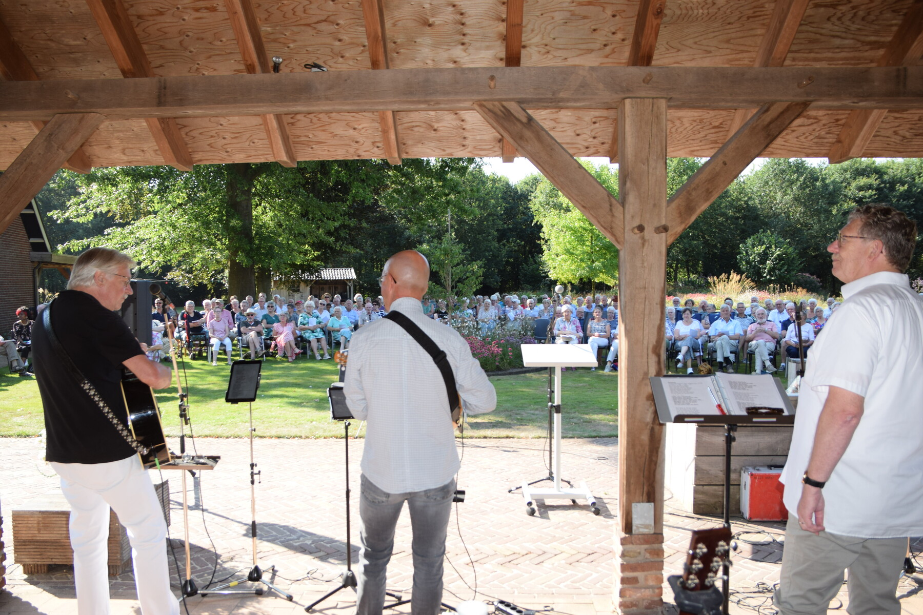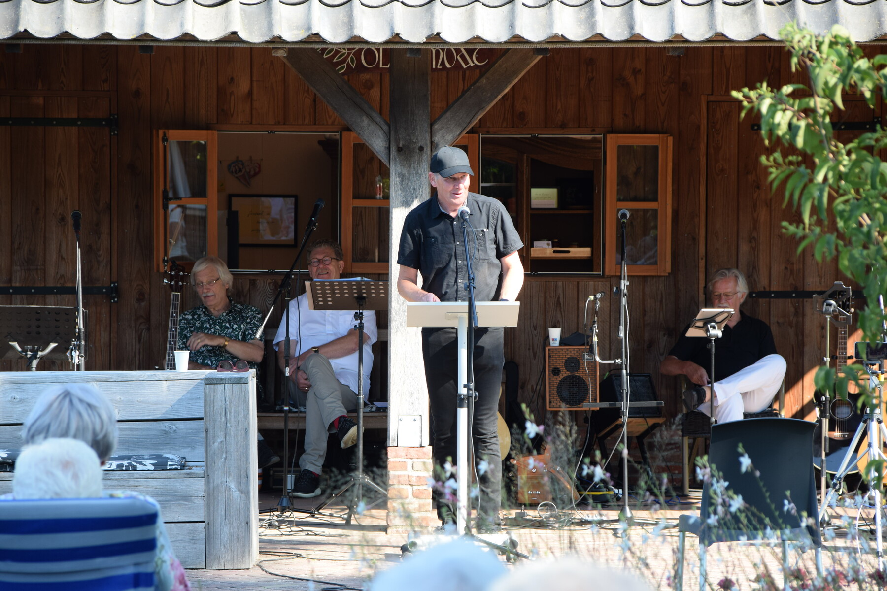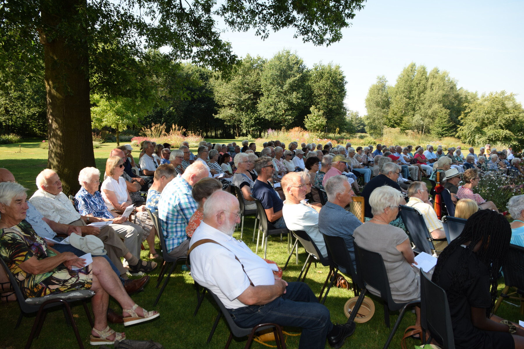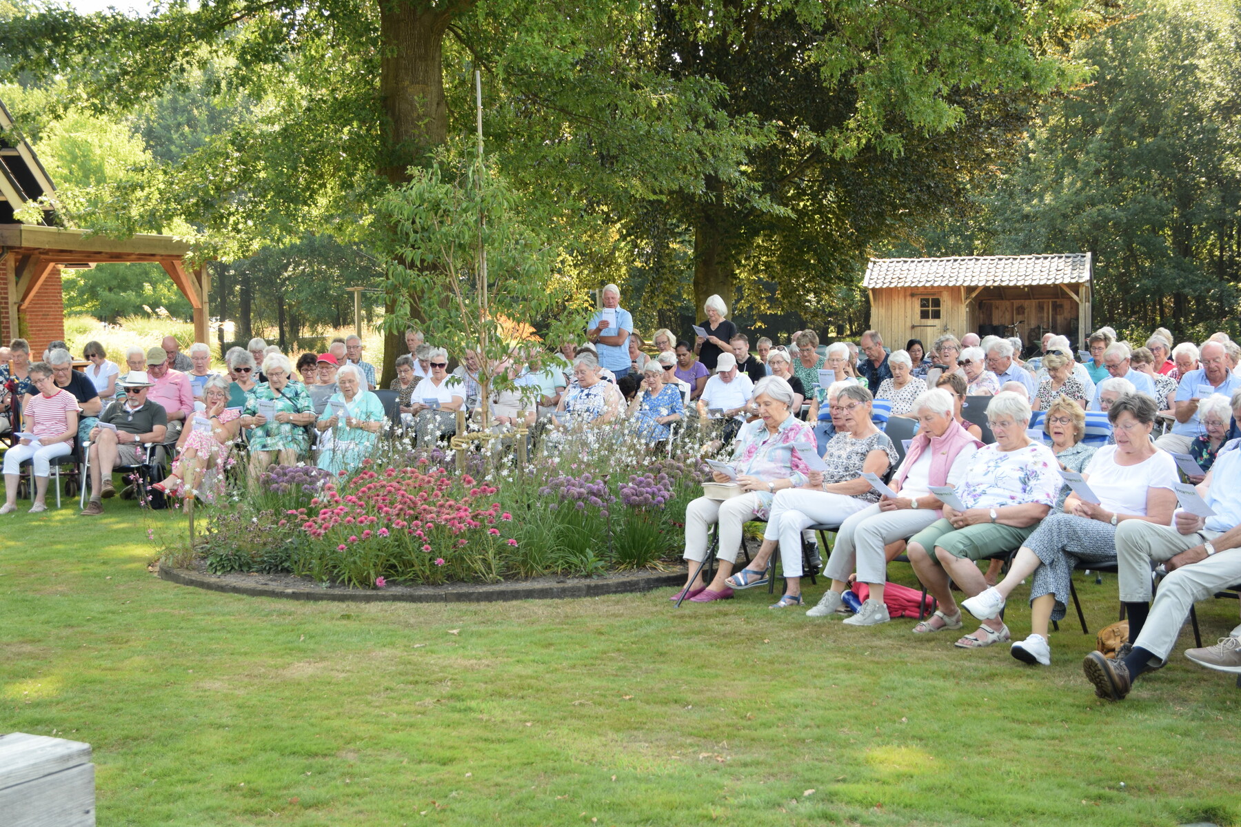 Als ds. Hans Hinkamp vraagt om het stil te maken in ons hart, spreekt de natuur ook een woordje mee. Juist op dat moment laat de kraaiende haan luidkeels van zich horen. Hiermee is de toon van deze bijeenkomst wel duidelijk gezet. Er heerst vanochtend een meer dan gastvrije, blije sfeer en in deze prachtige omgeving zijn we allemaal samen ‘thuis’.