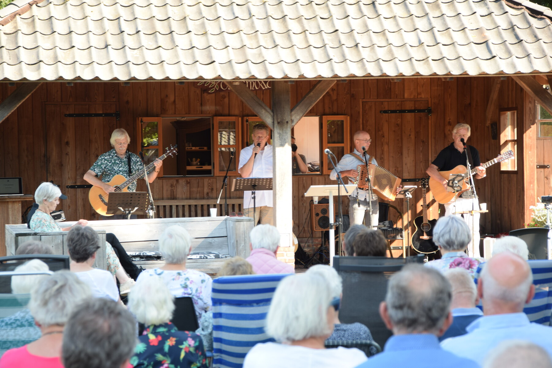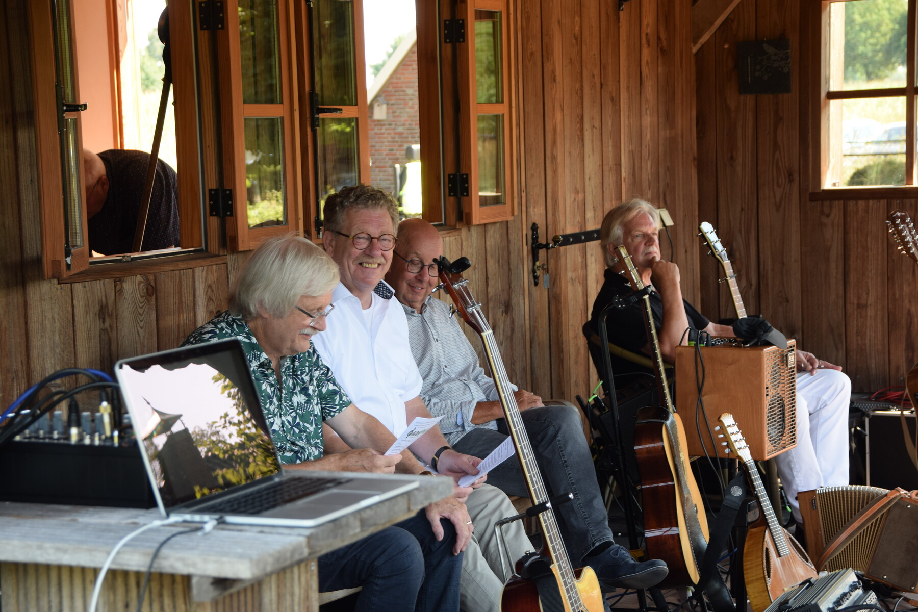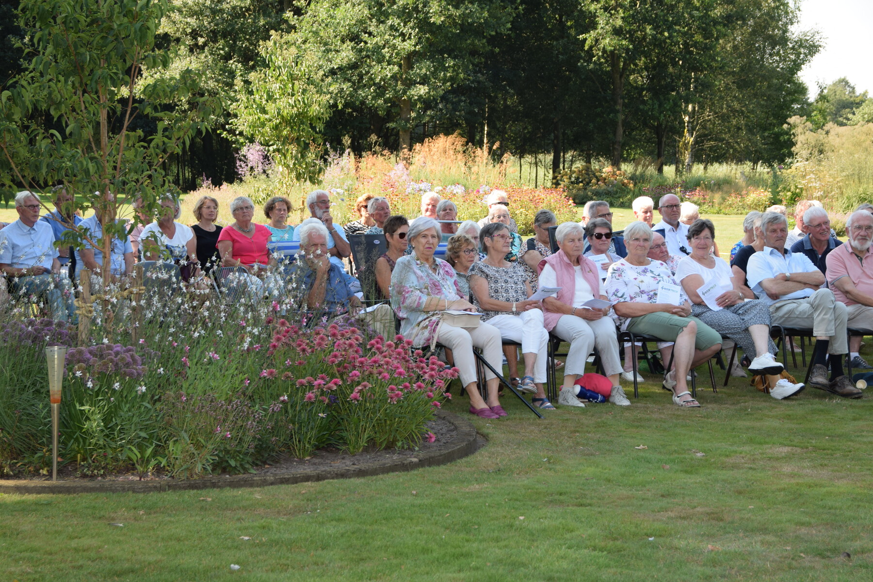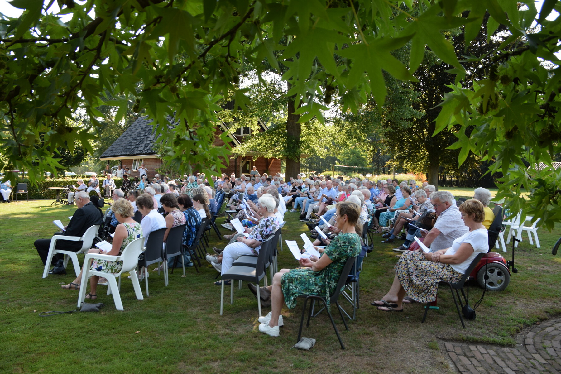 Als ds. Hans Hinkamp vraagt om het stil te maken in ons hart, spreekt de natuur ook een woordje mee. Juist op dat moment laat de kraaiende haan luidkeels van zich horen. Hiermee is de toon van deze bijeenkomst wel duidelijk gezet. Er heerst vanochtend een meer dan gastvrije, blije sfeer en in deze prachtige omgeving zijn we allemaal samen ‘thuis’.