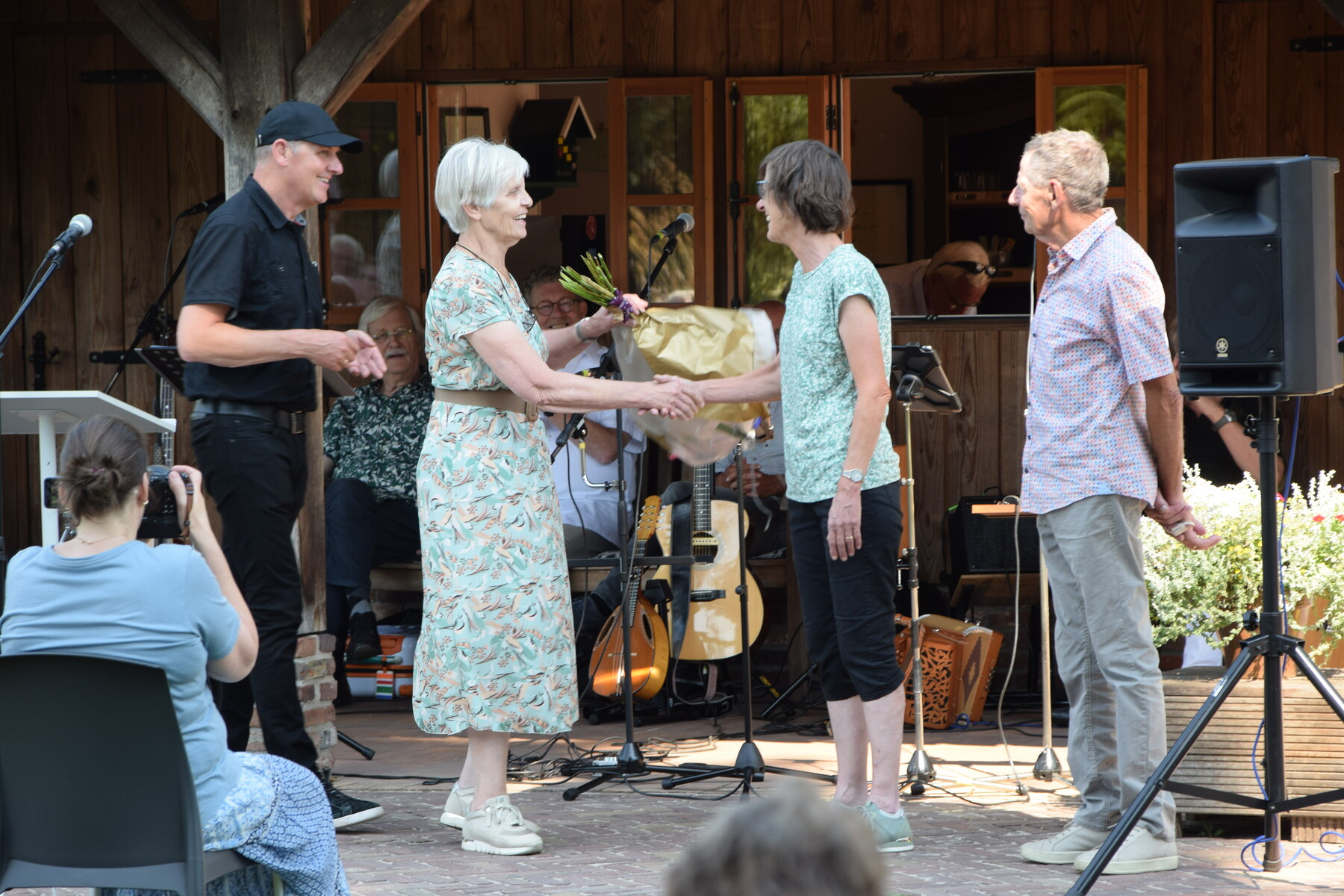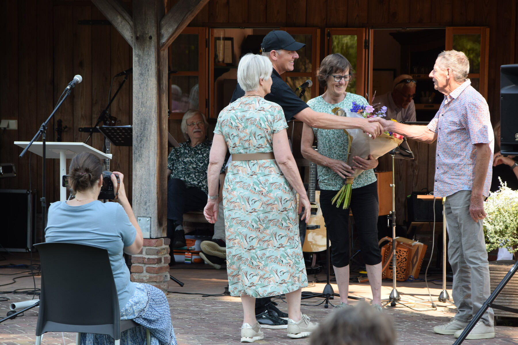 Bij het bedankje van beide voorgangers aan Annie en Jos, die ons allemaal zò gastvrij hebben ontvangen, hoort een prachtig boeket. En samen met het applaus dat daarna klinkt, zorgt dit stiekempjes voor een ontroerde traan bij Annie.