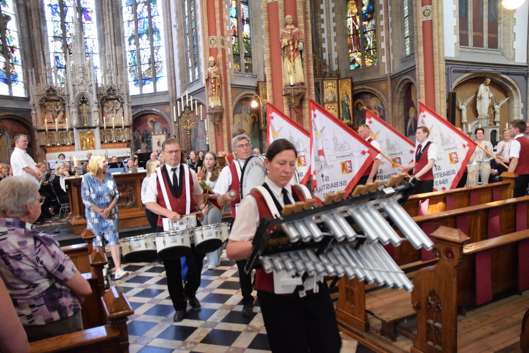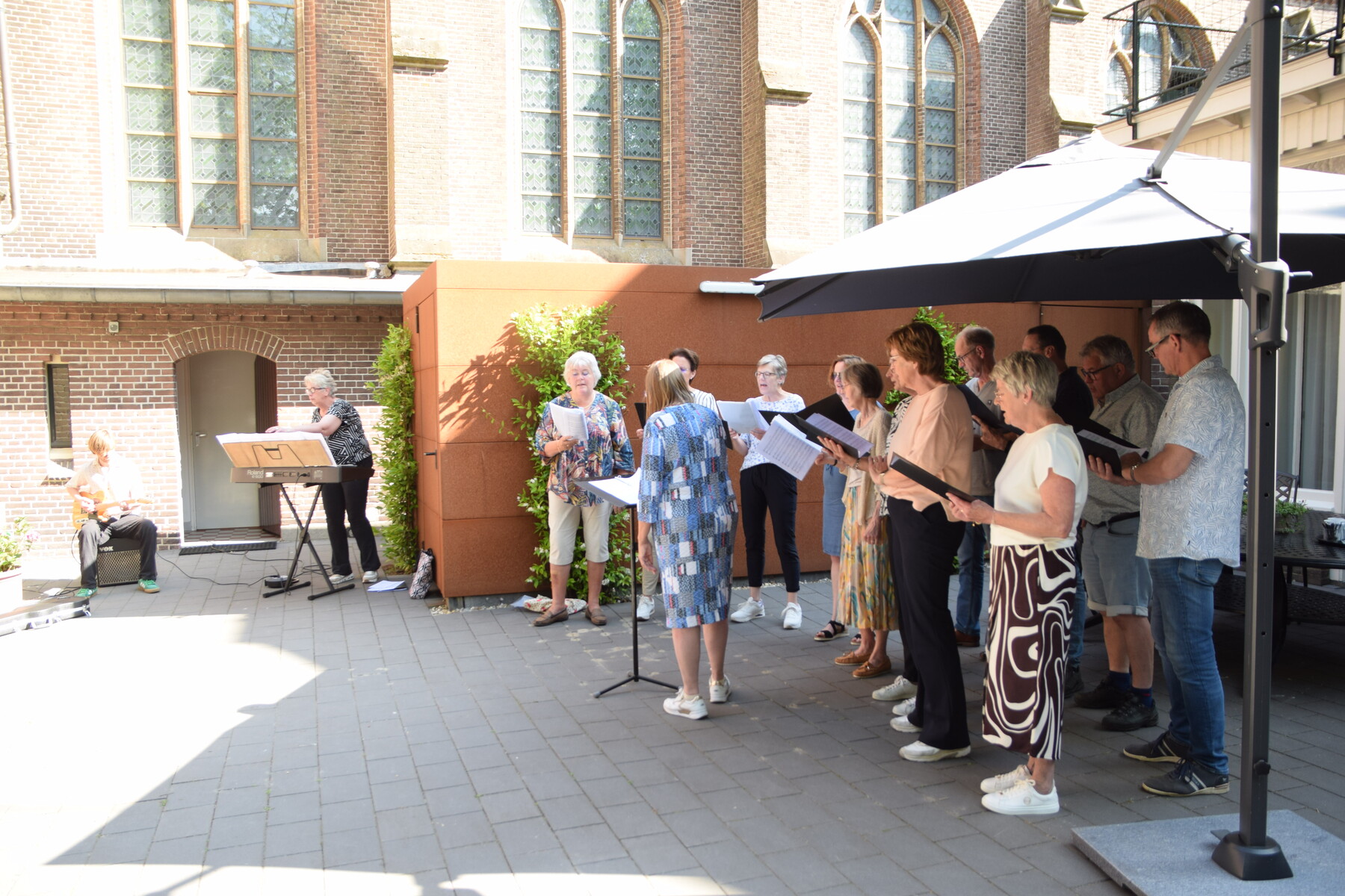 Je ziet o.a. het projectkoor met muzikanten inzingen bij de buren, Woonzorg Zieuwent, de Harmonie Zieuwent -Mariënvelde en natuurlijk, in vol ornaat, Schutterij Sint Sebastiaan met hun konings- en prinsenpaar.