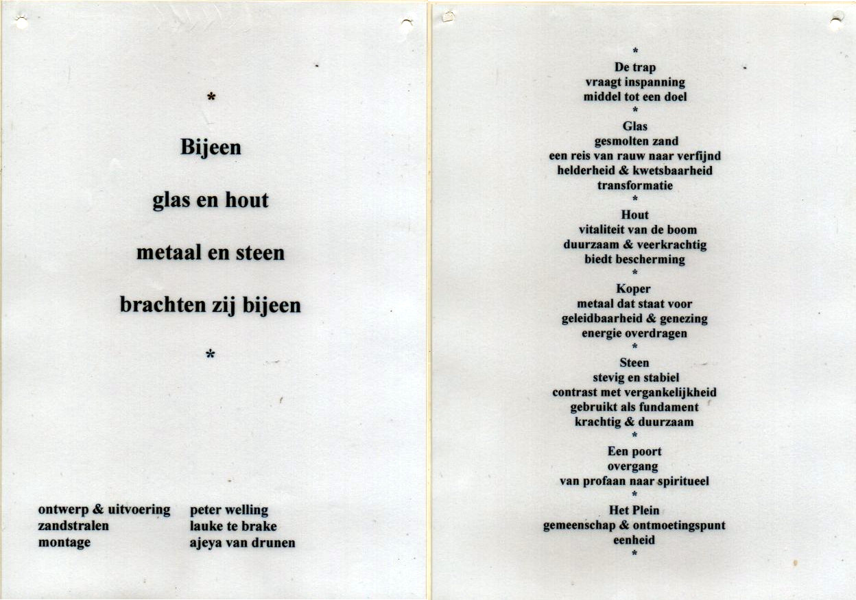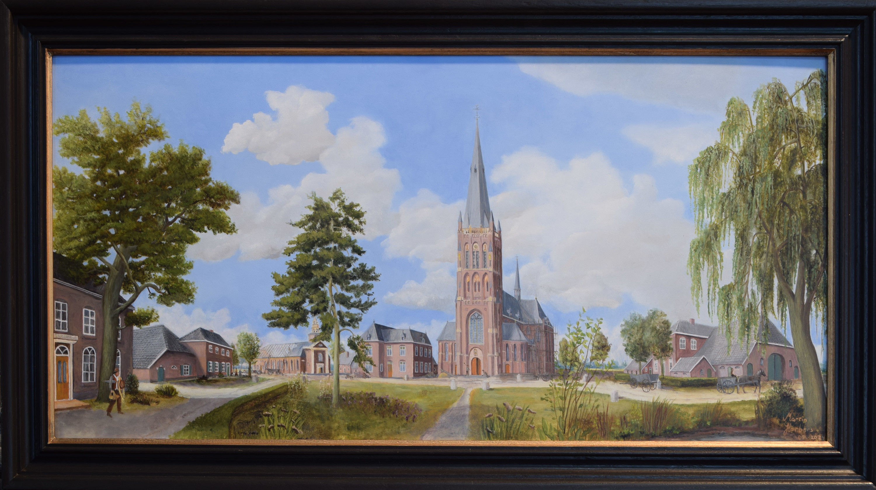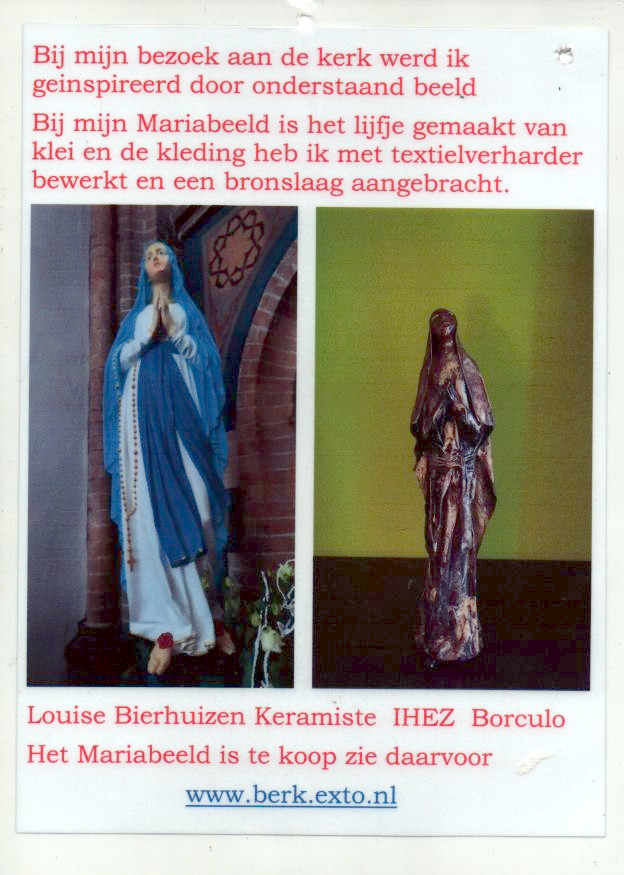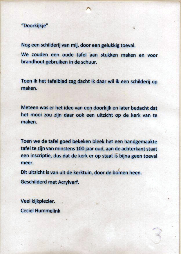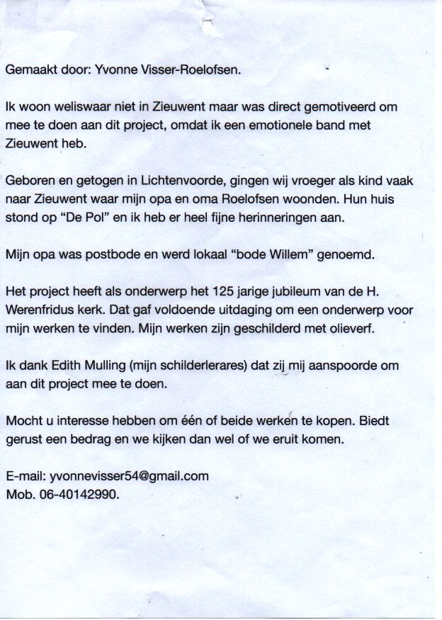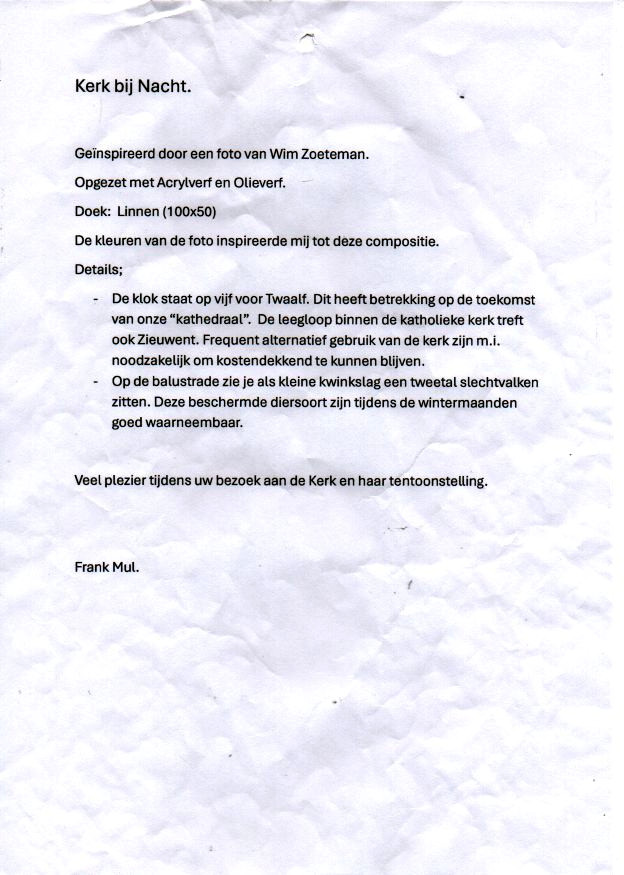 Mijn antwoord daarop was : ”Ja!….ik wil heel graag een expositie van kunstwerken houden in de kerk. Kunstwerken, om de mensen van tòen, die de kerk met eigen handen gemaakt hebben te eren, door de mensen van nù een kunstwerk te laten maken over de kerk.