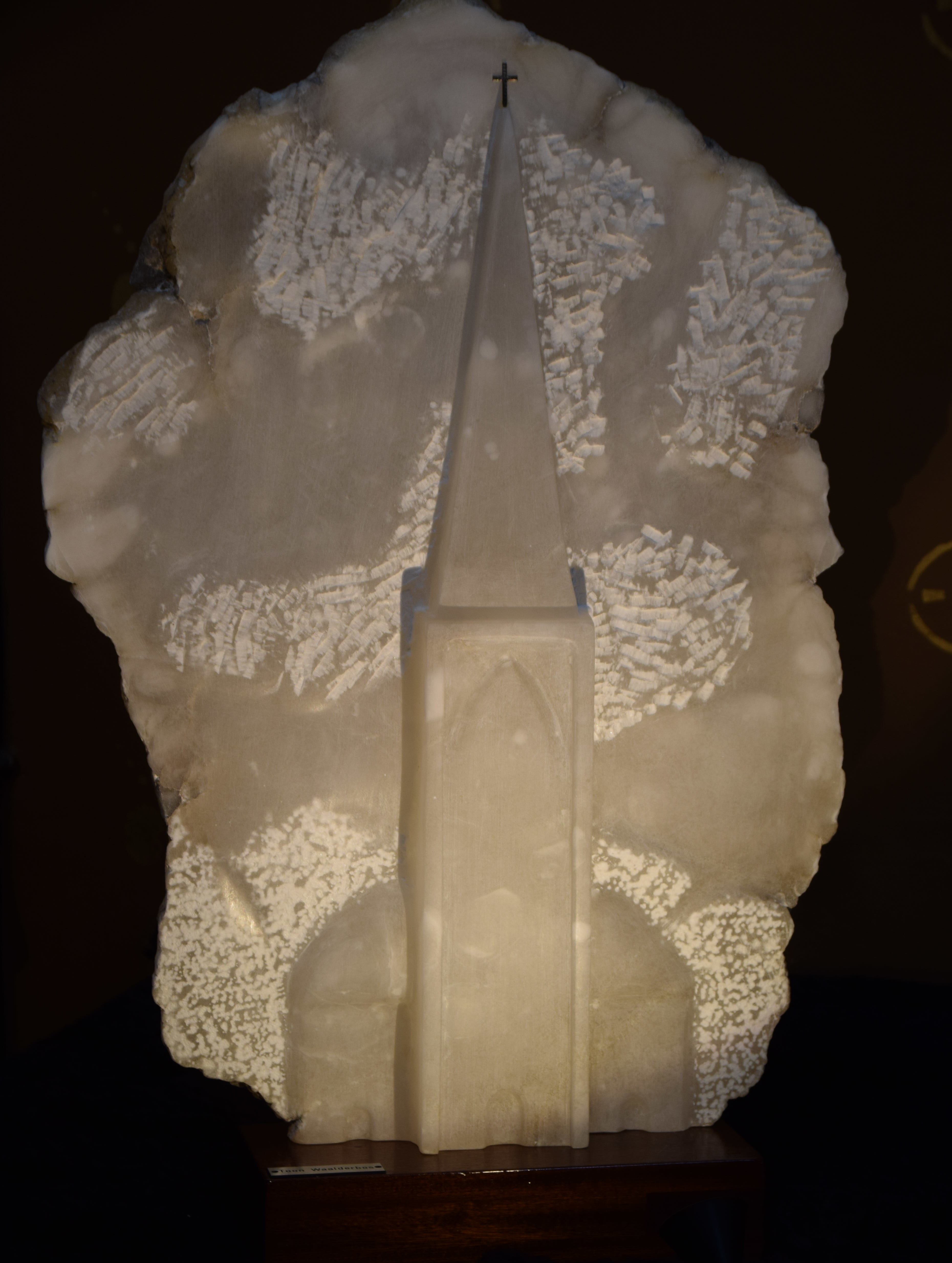Het werk is een afdruk van de kerk en is gemaakt van witte albast.