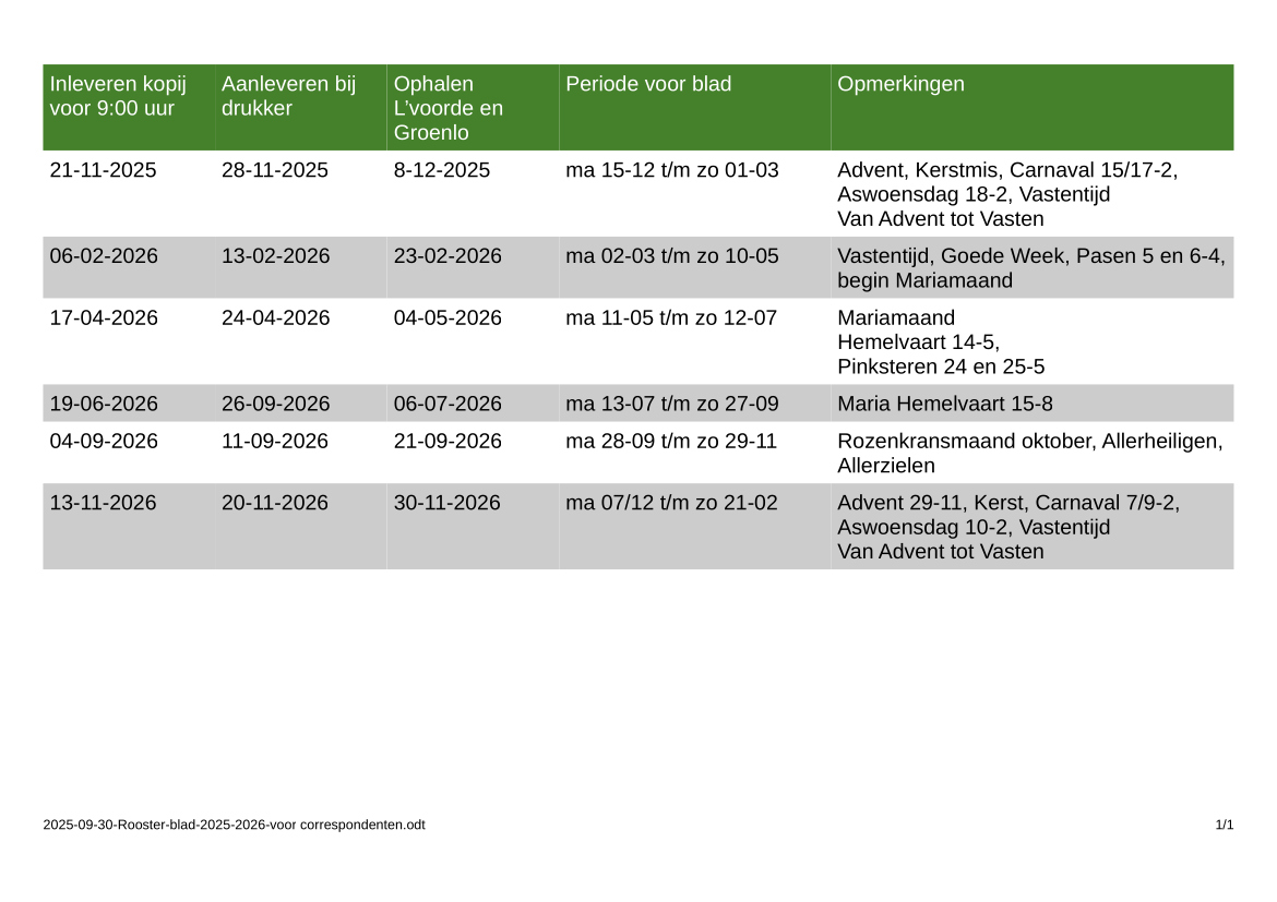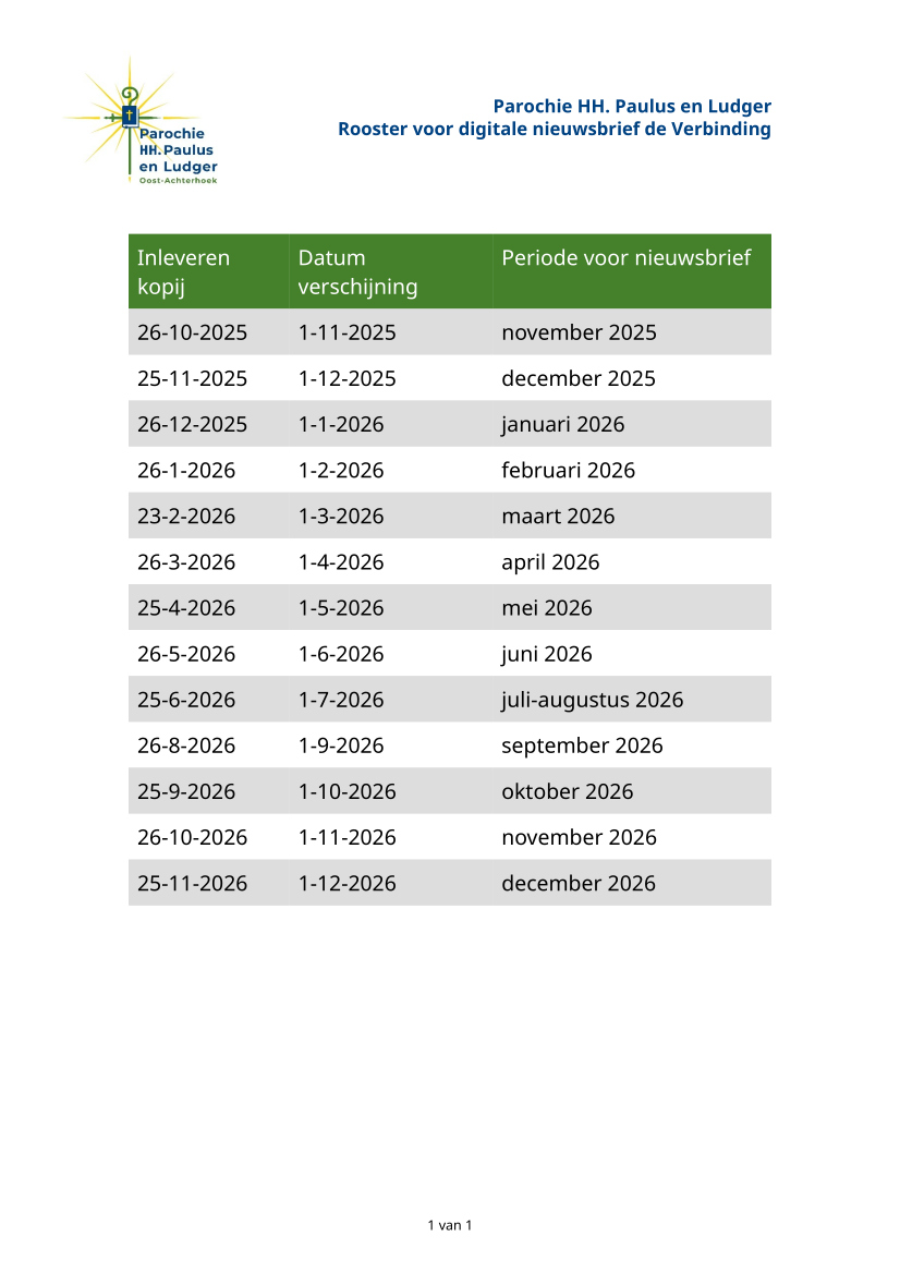 De redactieroosters voor het parochiemagazine en de nieuwsbrief zijn tot eind 2026 bekend. Klik op een van de roosters om deze te bekijken.