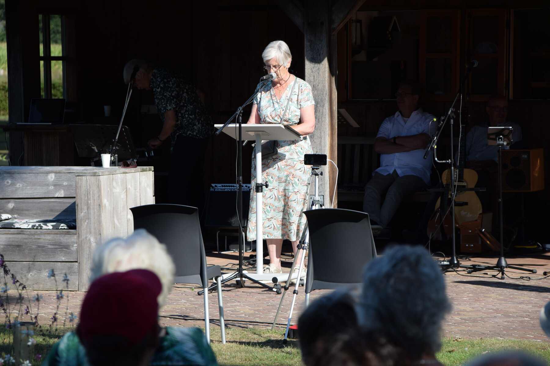Als ds. Hans Hinkamp vraagt om het stil te maken in ons hart, spreekt de natuur ook een woordje mee. Juist op dat moment laat de kraaiende haan luidkeels van zich horen. Hiermee is de toon van deze bijeenkomst wel duidelijk gezet. Er heerst vanochtend een meer dan gastvrije, blije sfeer en in deze prachtige omgeving zijn we allemaal samen ‘thuis’.