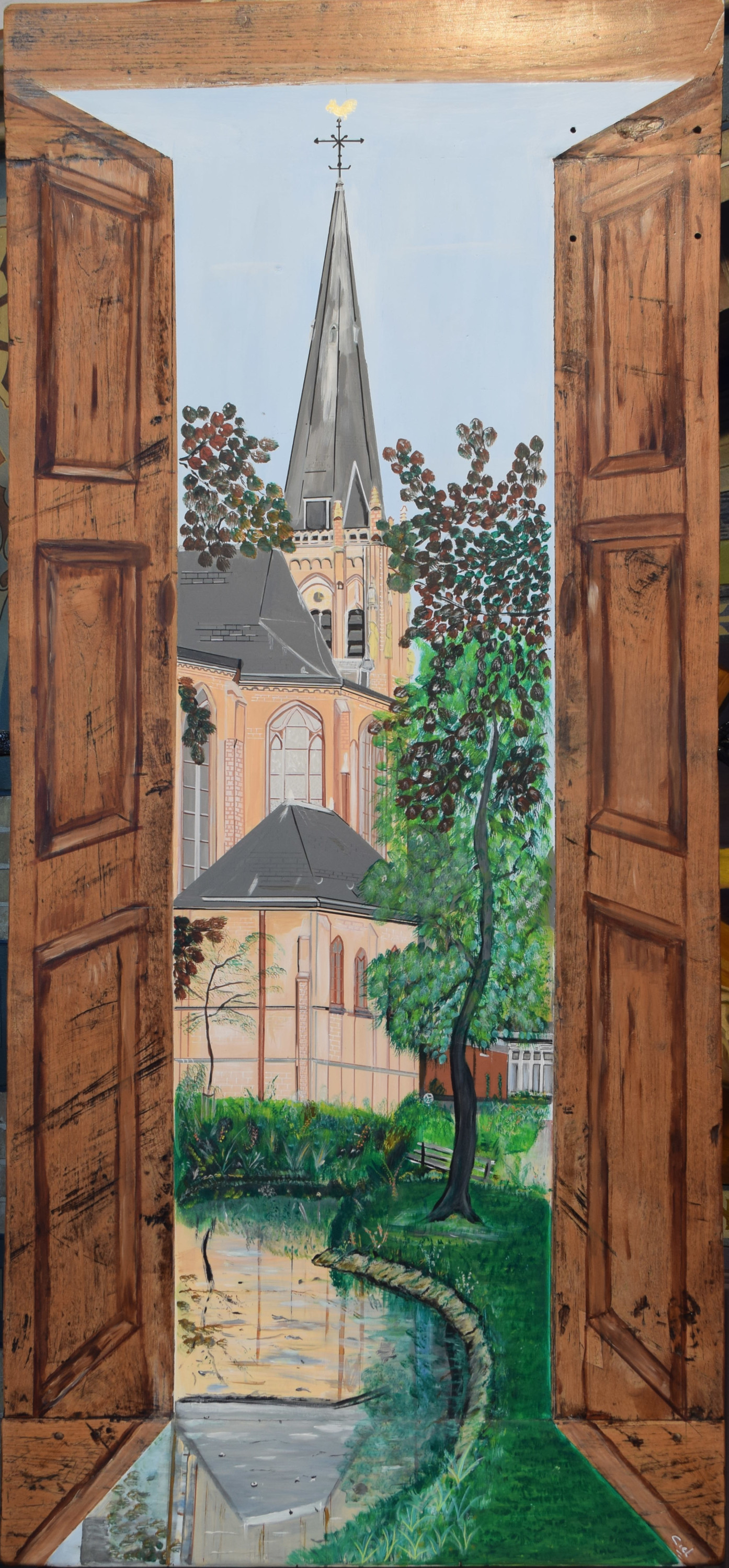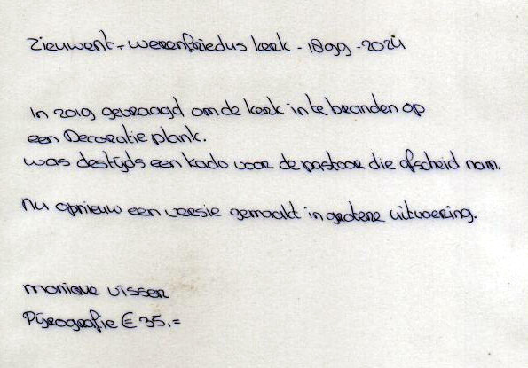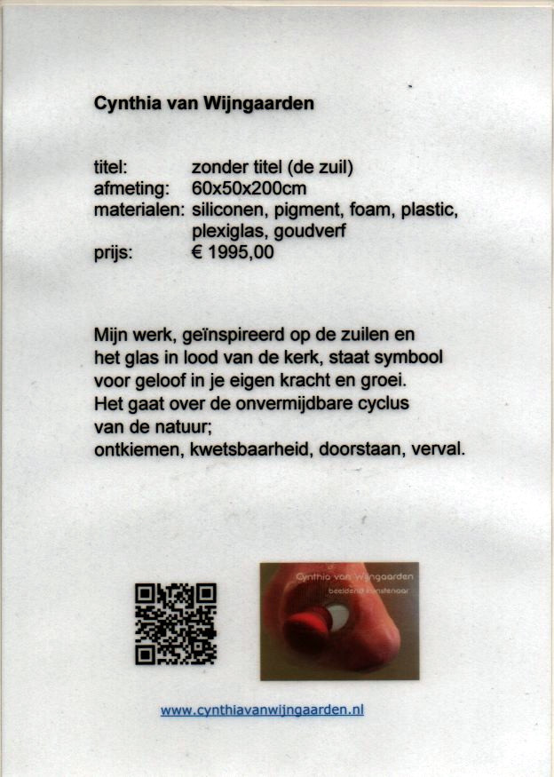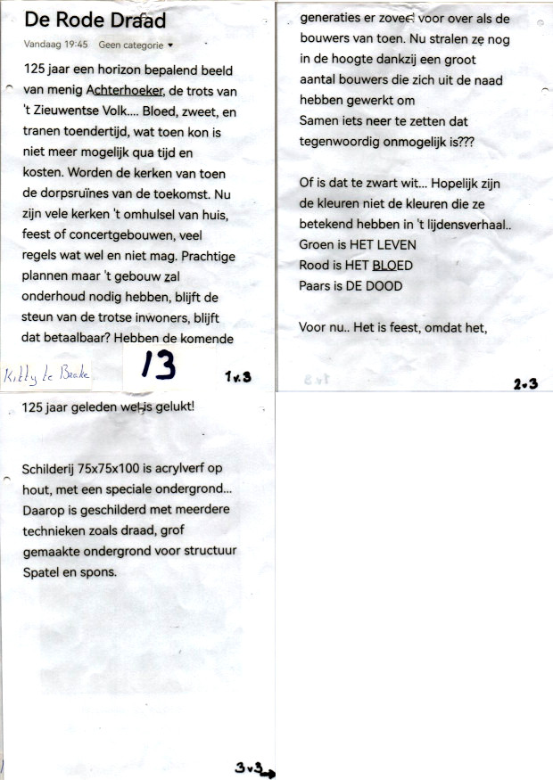 Mijn antwoord daarop was : ”Ja!….ik wil heel graag een expositie van kunstwerken houden in de kerk. Kunstwerken, om de mensen van tòen, die de kerk met eigen handen gemaakt hebben te eren, door de mensen van nù een kunstwerk te laten maken over de kerk.