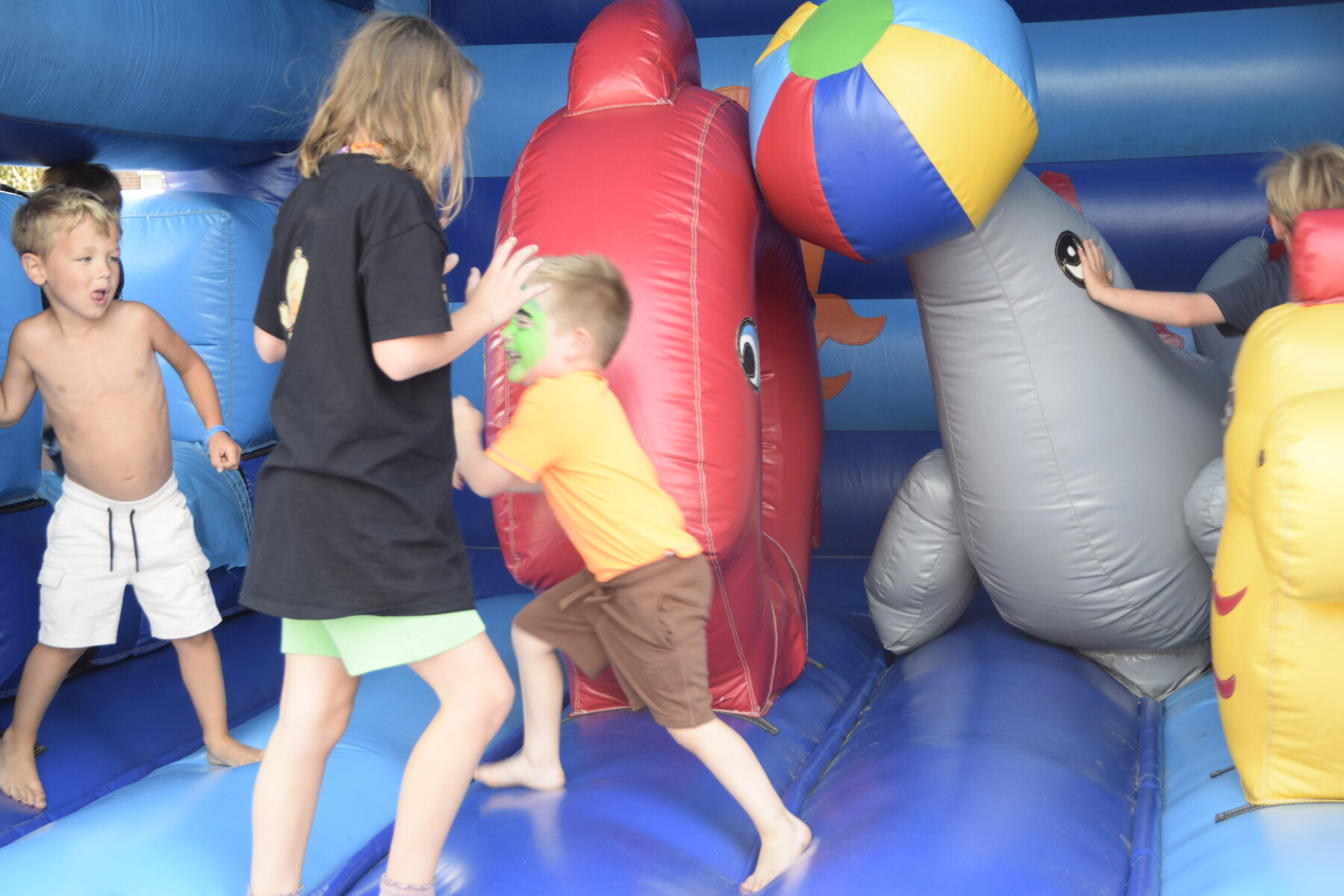 En: in de middag was er voor de kinderen van alles te doen. Daar was de viering in de Groene Kathedraal natuurlijk niet aan besteed. Dus: zandbak, springkussen en je laten schminken. Dit alles werd opgevrolijkt met gezellige muziek van de band Catweazle.